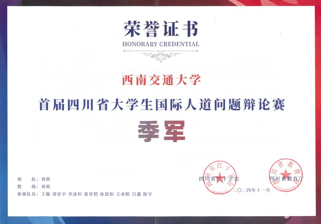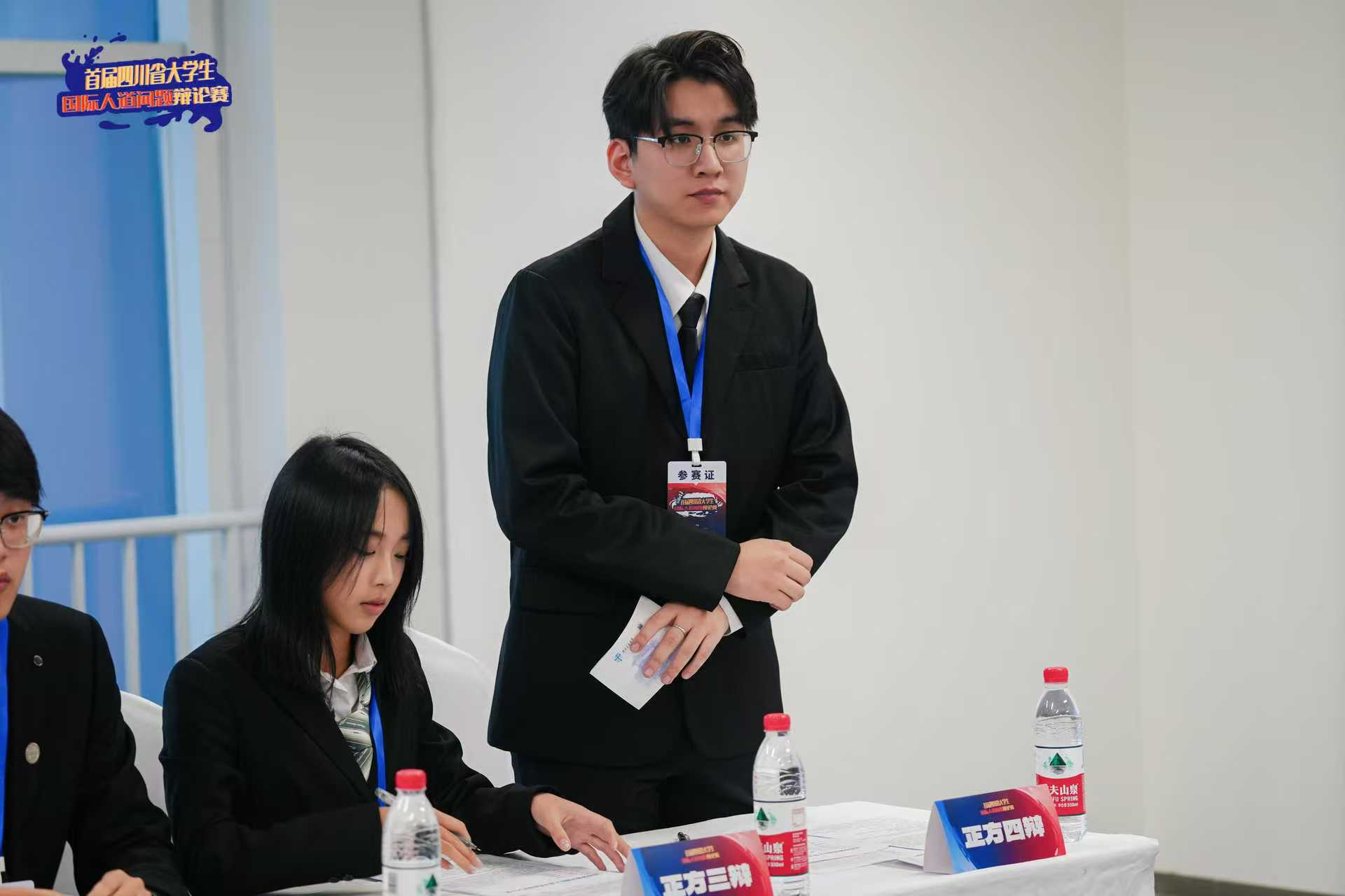 2024年11月23日,首届四川省大学生国际人道问题辩论赛决赛暨颁奖活动在成都举行。该赛事由四川省红十字会、四川省教育厅联合主办,四川日报报业集团《文摘周报》承办。太阳集团官网2024级法学硕士研究生刘星宇、2022级法学辅修本科生孙思怡代表校辩论队参赛,太阳集团官网吴昱副教授应校红十字会邀请进行专业指导,我校荣获季军。