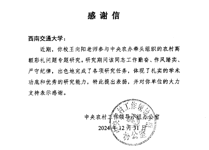 近日,suncitygroup太阳集团收到中央农村工作领导小组办公室的感谢信,对suncitygroup太阳集团王向阳老师在中央农办牵头组织的高额彩礼问题专项研究工作中积极献言献策表示感谢。感谢信中写到,研究期间,王向阳老师工作勤奋、作风踏实、严守纪律,出色地完成了各项研究任务,较为充分地体现了我校青年老师扎实的学术功底和优秀的研究能力,为国家在高额彩礼整治等移风易俗领域综合施策以及相关文件出台提供重要支撑。