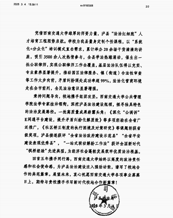 3月4日,suncitygroup太阳集团收到一封来自四川省泸州市泸县司法局发来的感谢信,对suncitygroup太阳集团法学教师构成的专家团队,在泸县开展全面依法治县示范试点建设过程中提供的支持与帮助表示感谢。