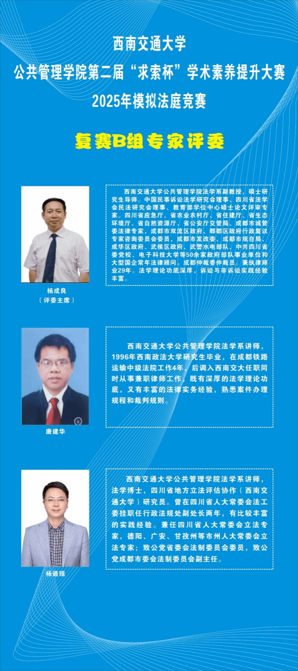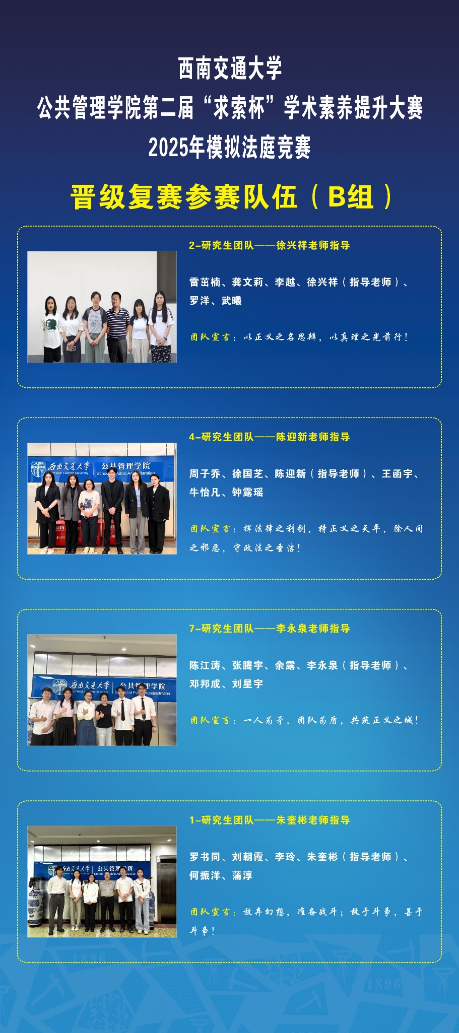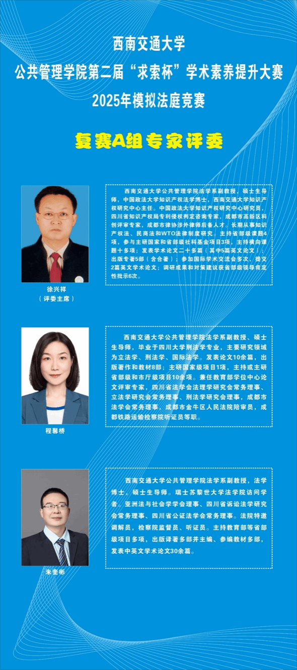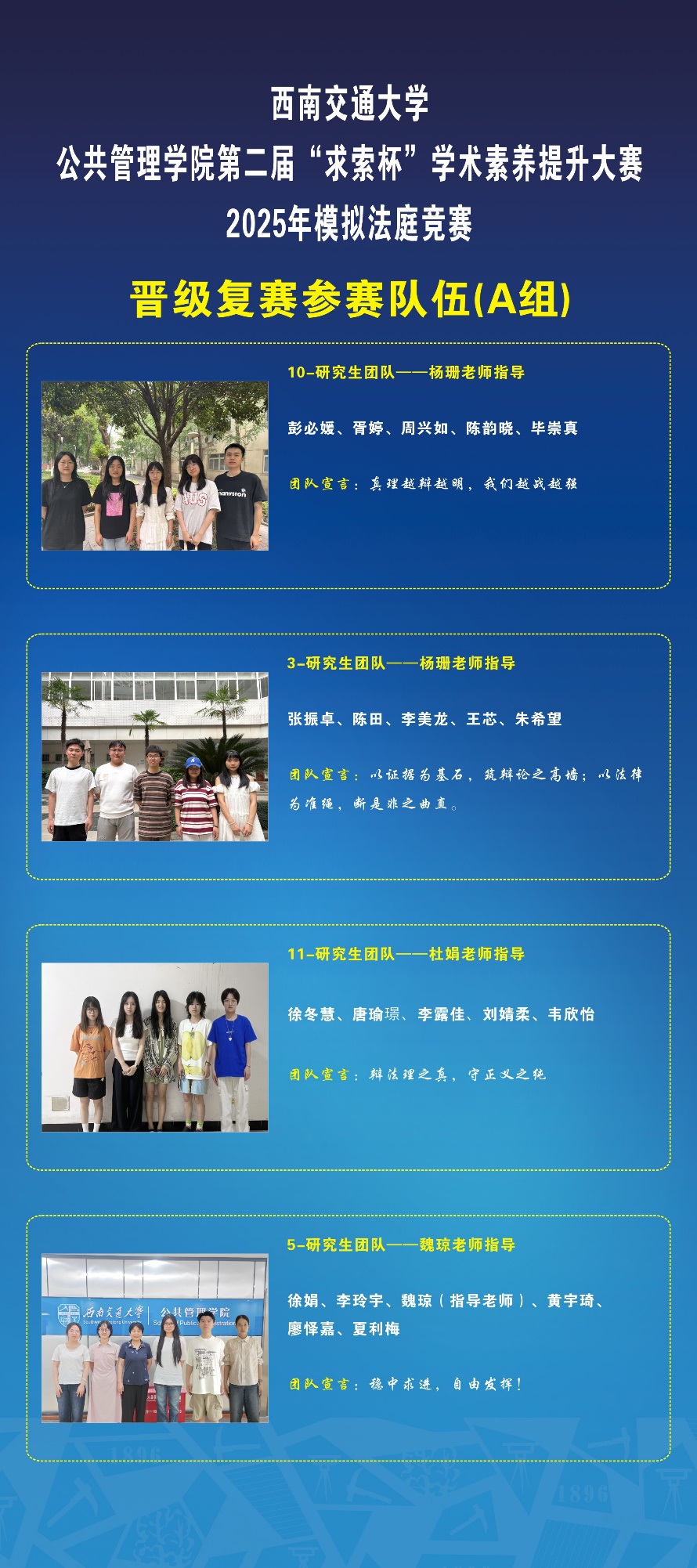 由suncitygroup太阳集团研究生院主办,suncitygroup太阳集团、成都市青白江区人民法院、suncitygroup太阳集团模拟法庭实验室、suncitygroup太阳集团团委、suncitygroup太阳集团学生会、研究生会、大学生法律协会承办的suncitygroup太阳集团第二届“求索杯”学术素养提升大赛2025年模拟法庭竞赛于4月初拉开帷幕。本次竞赛案例由成都市青白江区人民法院提供,我校研究生组成共11支参赛队参加了本次模拟法庭竞赛。在初赛中各参赛团队根据竞赛案例案卷材料,提交了包括民事起诉状、民事答辩状、代理词、判决书等司法文书,由青白江区人民法院三位法官进行匿名评审,8支参赛队成功晋级,现通过抽签方式,分为A、B两组展开复赛。现对模拟法庭竞赛复赛赛事安排如下: