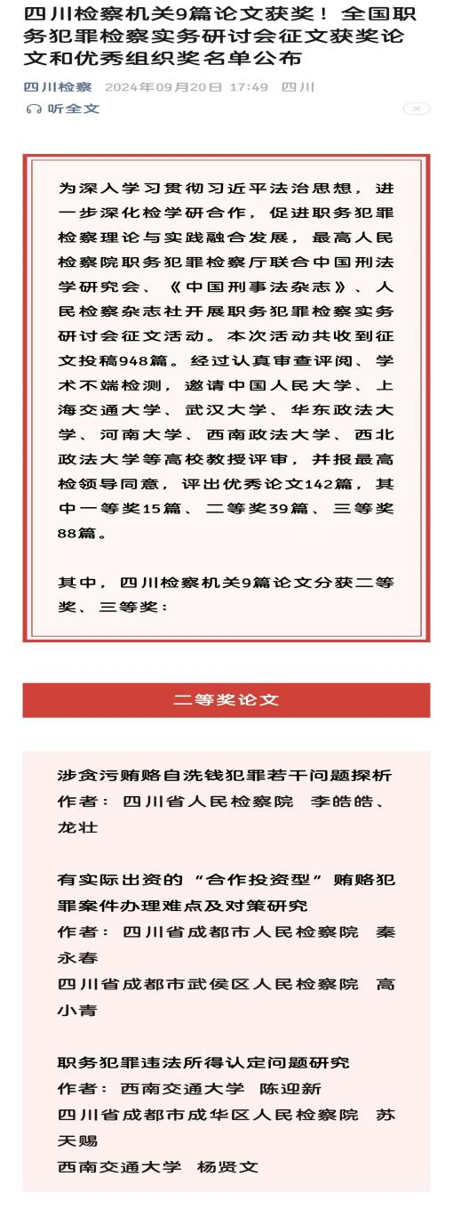为深入学习贯彻习近平法治思想,进一步深化检学研合作,促进职务犯罪检察理论与实践融合发展,最高人民检察院职务犯罪检察厅联合中国刑法学研究会、《中国刑事法杂志》、人民检察杂志社联合开展职务犯罪检察实务研讨会征文活动。本次活动共收到征文投稿948篇,经过认真审查评阅、学术不端检测,邀请北京大学、中国人民大学、上海交通大学、武汉大学、华东政法大学、河南大学、西南政法大学、西北政法大学和上海社科院法学所等高校教授评审,并报最高检领导同意后,评出一等奖15篇、二等奖39篇、三等奖88篇共计优秀论文142篇。四川检察机关共9篇论文获奖,其中3篇论文获二等奖、6篇获三等奖。人民检察杂志公众号、四川省人民检察院公众号等均进行了报道。