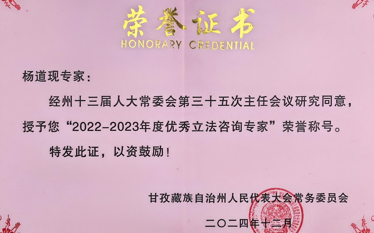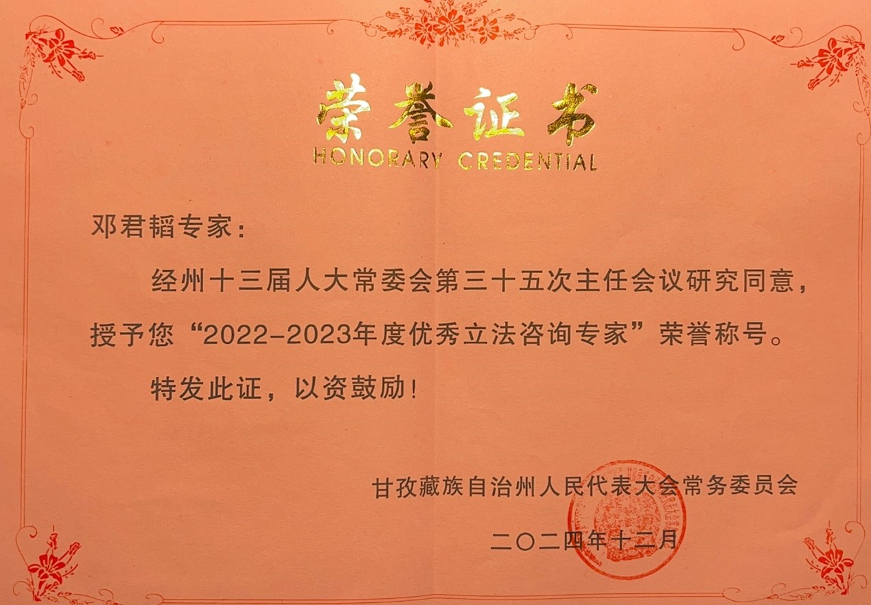 近日,从甘孜藏族自治州人大常委会获悉,经州十三届人大常委会第三十五次主任会议研究同意授予太阳集团官网教师邓君韬、杨道现 “2022-2023年度优秀立法咨询专家”荣誉称号。
