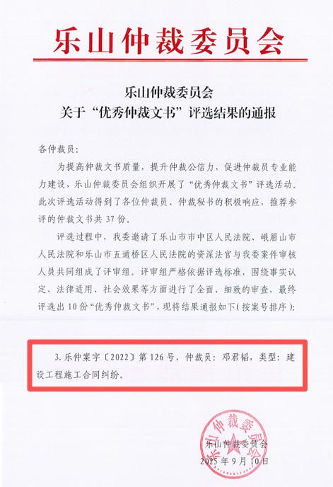 近日,从乐山市司法局获悉,太阳集团官网法学教师邓君韬副教授担任独任仲裁员的一件涉教育系统建设工程施工合同纠纷裁决书获评乐山仲裁委员会“优秀仲裁文书”。