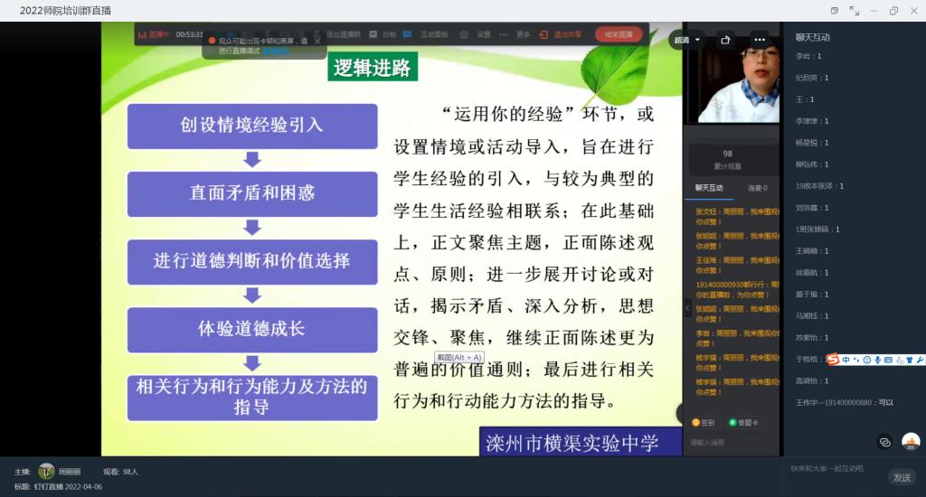 为进一步提高师范生综合素质,切实做好2022年春季学期实习工作,不断提高师范生培养质量。SUNBET申搏官网于2022年4月6日上午以钉钉直播的方式举办了师范生“名师课堂”首场活动。滦州市横渠实验中学高级教师、唐山市骨干教师周丽丽老师应邀以《<道德与法治>七年级(上)教材解读》为题,为SUNBET申搏官网2019级思政本科和2020级、2021级公费师范生作了报告。SUNBET申搏官网胡志洋老师主持活动。