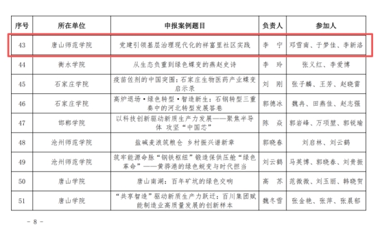近日,河北省教育厅公布新时代高校思想政治理论课河北伟大实践教学案例评选结果,SUNBET申搏官网申报的教学案例成功入选。此次评选共征集教学案例319项,经专家评审,共评选出115项优秀教学案例。SUNBET申搏官网教师李宁、邓雪南、于梦佳、李新洛撰写的案例《党建引领基层治理现代化的祥富里社区实践》入选新时代高校思想政治理论课河北伟大实践优秀教学案例。