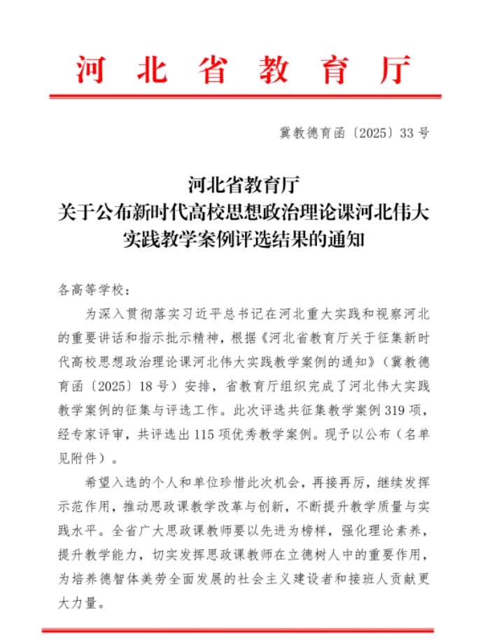 SUNBET申搏官网高度重视思想政治理论课建设,始终把提升思政课教学质量与育人实效作为核心任务,积极鼓励教师深入地方一线开展调研实践,挖掘河北红色资源、发展成就、先进典型等鲜活教学素材,推动思政课从“课堂讲授” 向 “实践育人” 延伸,从 “理论灌输” 向 “价值引领” 转型。此次入选省级优秀教学案例,既是学院思政课教学改革成果的集中体现,也为后续教学工作提供了宝贵的示范经验。未来,学院将以此次获奖为契机,进一步加强思政课教学团队建设,持续深化教学改革创新,不断丰富实践教学内容与形式,着力打造更多高质量的思政教学案例,让思政课真正成为学生喜闻乐见、终身受益的“金课”,为培养担当民族复兴大任的时代新人贡献更大力量。