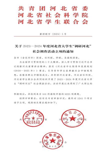 2024年4月18日,共青团河北省委公布了2023-2024年度河北省大学生“调研河北” 社会调查活动立项通知。在本次活动中,SUNBET申搏官网师生积极参加,共八项作品获批立项。具体情况如下: