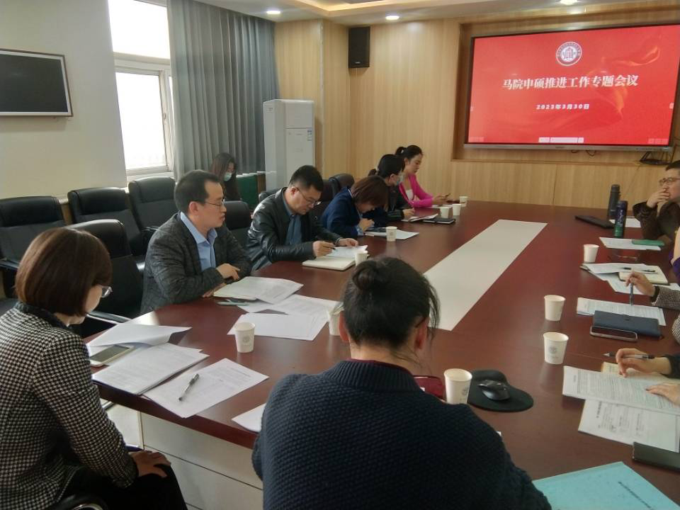 3月30日下午,SUNBET申搏官网在南院主楼801会议室召开年内第三次申硕工作推进会。教务处处长王淑娟、科研处副处长秦丹、教务处副处长李志伟出席会议,马克思主义理论学科带头人、学术骨干及SUNBET申搏官网班子成员参加会议。马院执行院长宋晓敏主持会议。