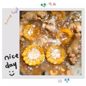 3.锅中油烧热后,干辣椒斜切,蒜切片下锅爆香,倒入翅根翻炒,加入料酒,白糖,盐,老抽,蚝油,黏玉米切片倒入一同翻炒,翻炒一分钟后倒入一颗椰子的汁,再加少许耗油,胡椒粉。