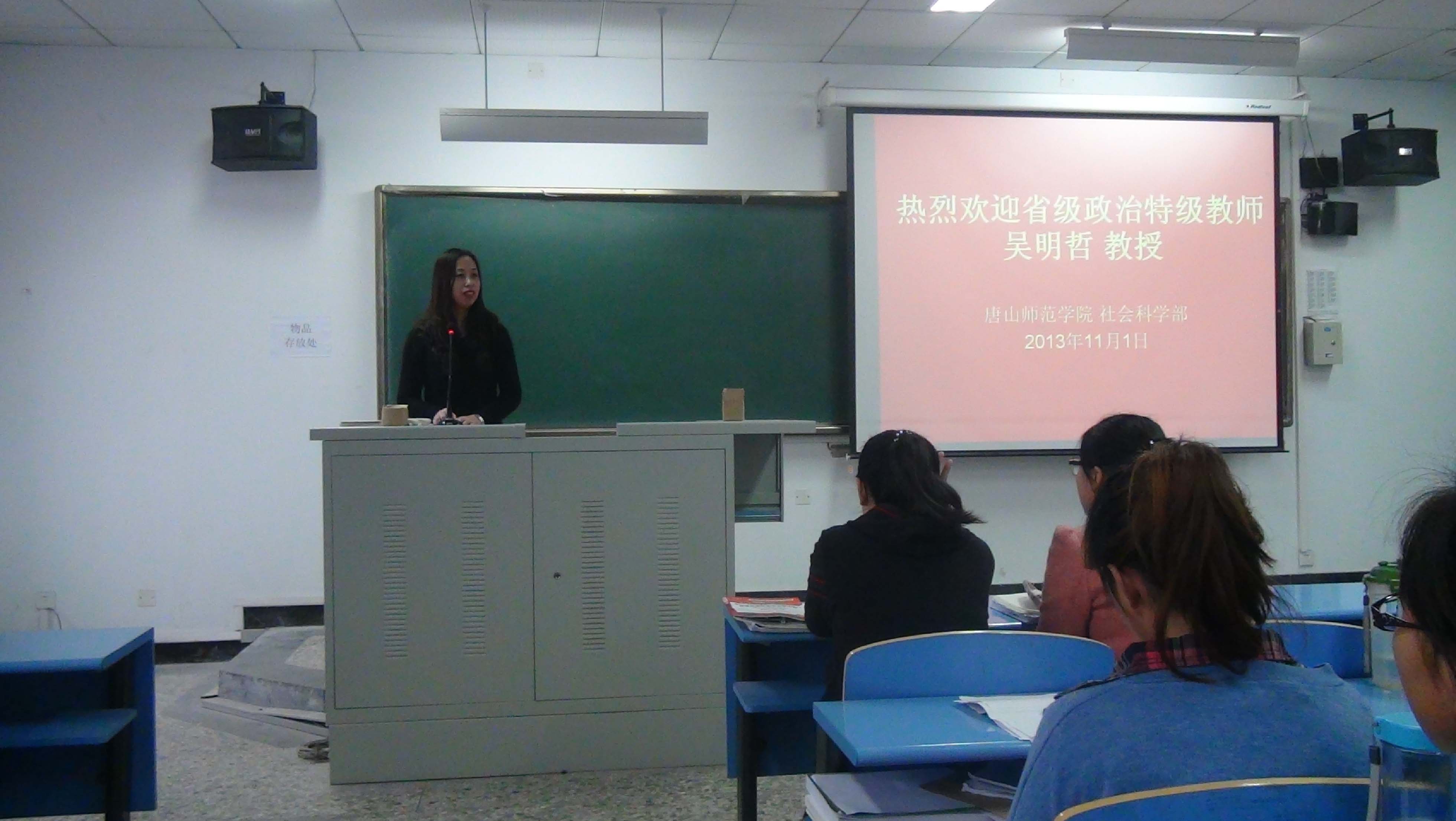 111日(周五)下午,河北省级政治特级教师、首届河北省中小学政治学科名师、唐山市教育局思政处吴明哲教授在文412为社科部2011级本科、2012级专接本和2012级本科三个班举办了《感悟成长》的专题讲座。吴明哲教授以自己的成长以及工作经历讲述了对人生的感悟: 1.笃学进取,拓宽视野;2.求真务实,虚心求教;3.精益求精,追求完美;4.致力教研,探索创新;5.乐教善导,爱心育人;6.默默耕耘,甘愿奉献。她用20多年的工作实践诠释了“如何成为幸福的高中思想政治教师”。通过这次讲座,学生受益匪浅。2013届毕业生李薇恰好聆听了讲座,她说,今天受益最多的是我,我正在为职业选择发愁,吴教授的讲座使我明白今后的从教之路该如何走。