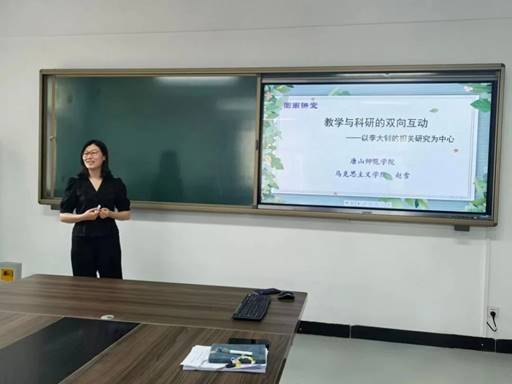 讲座中,赵雪博士指出:“教学是科研选题的灵感,科研是教学的有力支撑。”赵雪博士以党的先驱人物李大钊的相关研究为核心,阐释在理论研究的基础上,教师如何进一步打破学科壁垒、深化学科间的融合,并借助技术手段提升效率,构建“科研引导教学、教学反哺科研”的可持续发展教学路径。最后以李大钊先生的话勉励现场师生:凡事都要脚踏实地去作,不驰于空想,不骛于虚声,而唯以求真的态度作踏实的工夫。以此态度求学,则真理可明,以此态度作事,则功业可就。