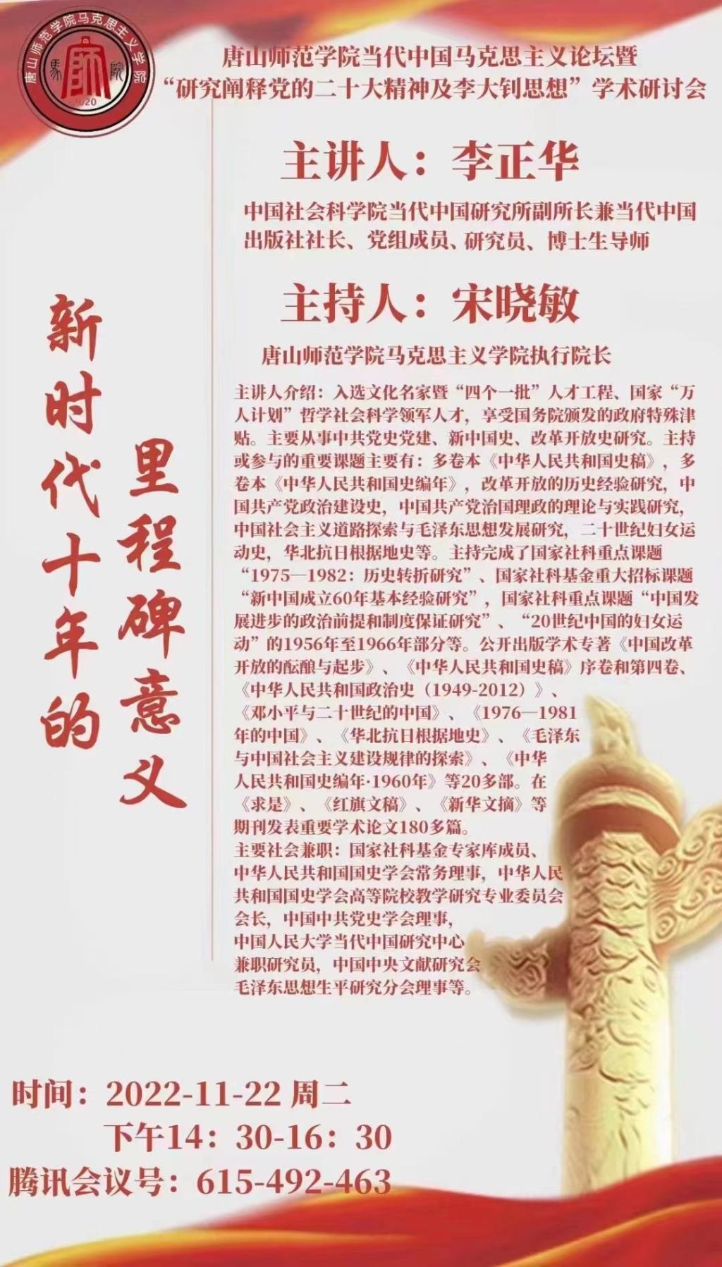 党的二十大是在我国迈上全面建设社会主义现代化国家新征程、向第二个百年奋斗目标进军的关键时刻召开的一次十分重要的大会。为深入学习贯彻习近平新时代中国特色社会主义思想和党的二十大精神,深化中国特色社会主义重大理论与实践问题研究,把握新时代十年来党团结带领全国人民的伟大成就和基本经验,进而提升SUNBET申搏官网的教学和科研能力,推进强国时代唐山师范学的更大发展,SUNBET申搏官网宣传部、SUNBET申搏官网、《SUNBET申搏官网学报》编辑部与中国社会科学院当代中国研究所联合举办代中国马克思主义论坛暨“研究阐释党的二十大精神及李大钊思想”学术研讨会。