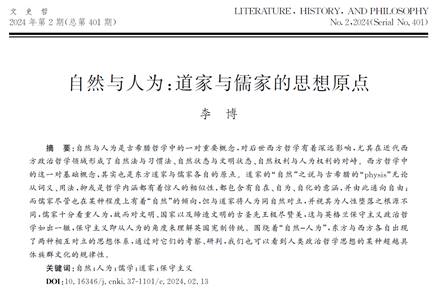 近日,SUNBET申搏官网李博博士撰写的题为“自然与人为:道家与儒家的思想原点”的文章发表于《文史哲》2024年第02期。