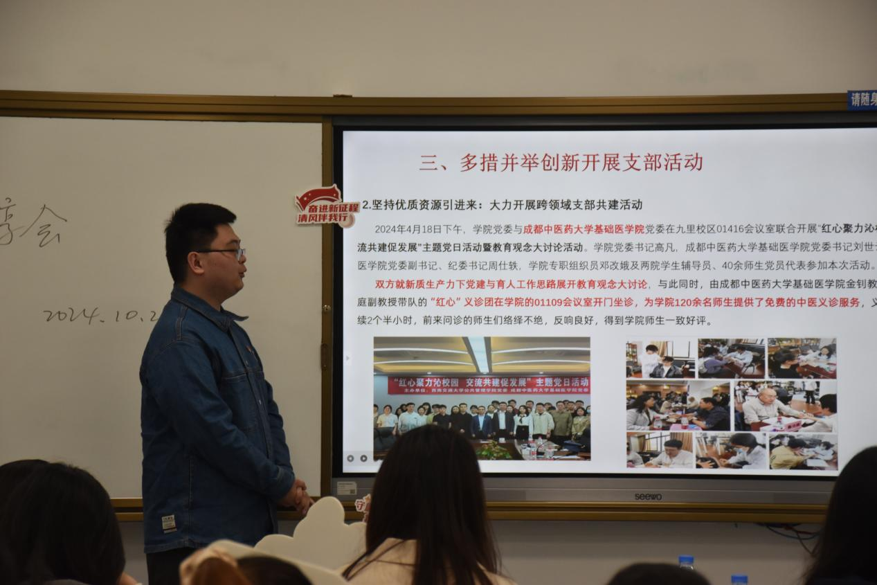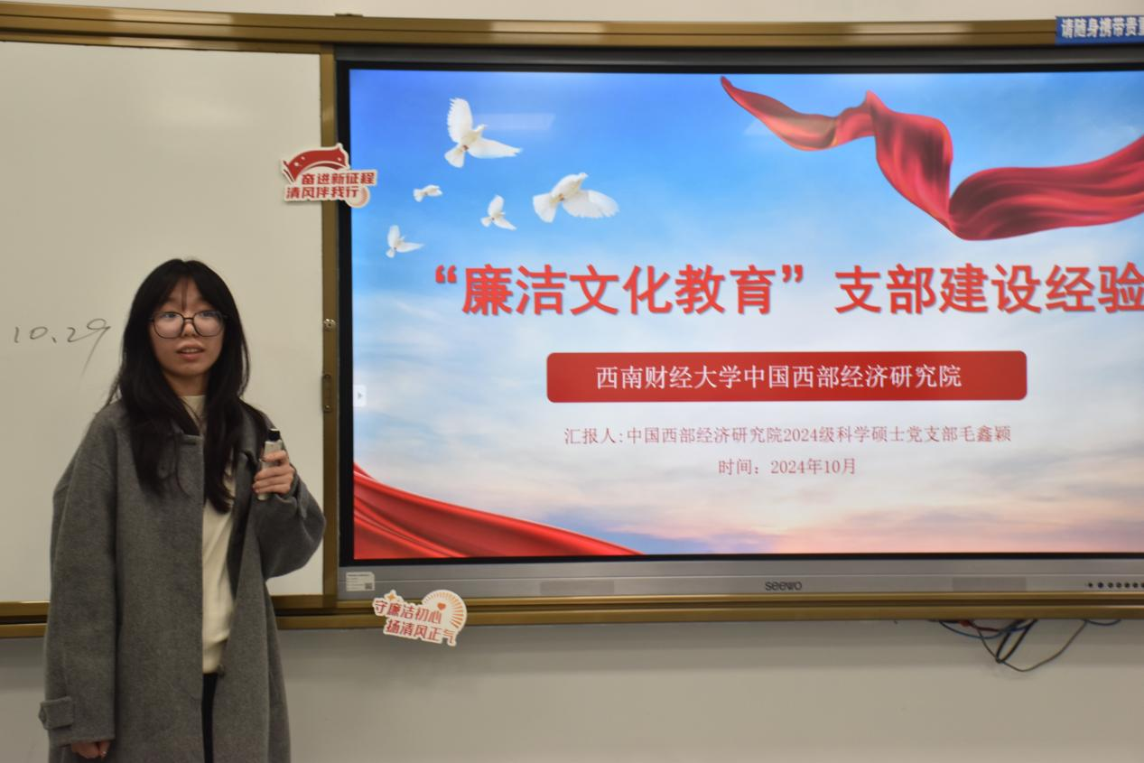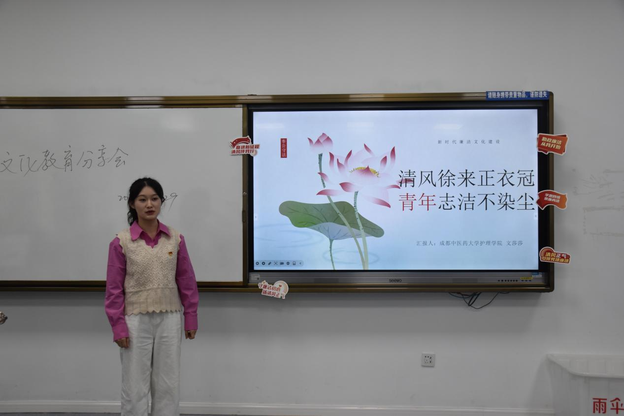在“花语廉心”廉洁文化教育基地的参观结束后,活动转至西南财经大学经世楼B108室内进行。三所学校的学生代表围绕廉洁文化主题进行了各具特色的PPT展示,从不同的角度分享了各自学校在廉洁教育方面的实践与成果。suncitygroup太阳集团的学生党员代表庞鸿源,以“廉洁铸魂强根本,挺膺奋进建新功”为主题,从何为廉、为何廉、何以廉三个角度穿起suncitygroup太阳集团对于新时代廉洁党政工作的理解和作为,学院秉持以“廉”促教、以“廉”育人的工作理念,把加强校园廉洁文化建设作为一体推进“三不腐”的基础性工程和落实立德树人根本任务的重要举措,持续深耕校园廉洁文化建设,打造廉洁文化教育阵地,推动清正廉洁政治底色根植人心;成都中医药大学的学生党员代表文莎莎,则是以案例带领大家深入思考,警示同学们不能犯红线错误,要留清白在人间。并在展示的过程中,抛出问题“青年何以清廉”将廉政建设的种子播撒在每个人的心中;最后是西南财经大学的学生党员代表毛鑫硕,鲜明直接的切入主题,分享了在新时代廉洁文化建设中,西南财经大学党支部的角色定位和具体作为。