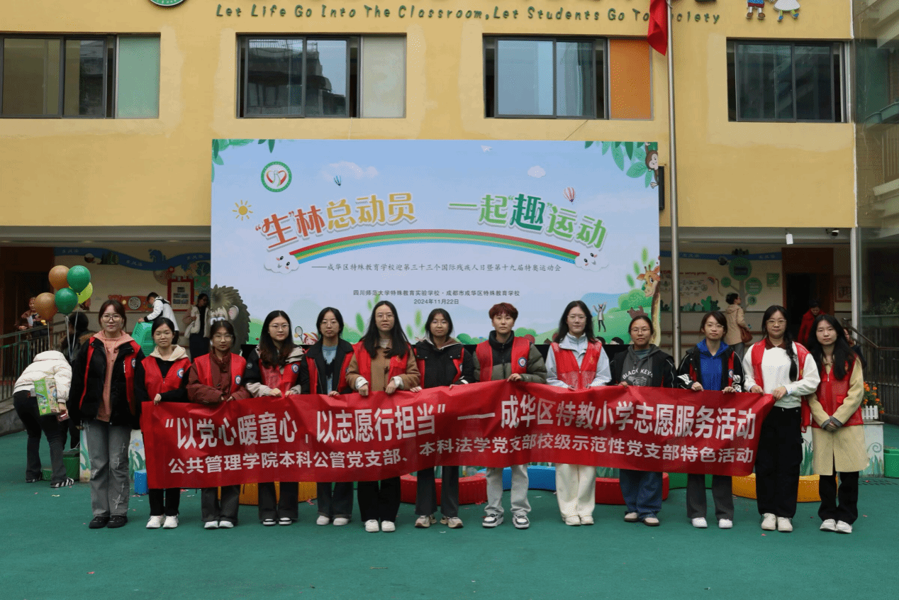 为深入学习贯彻习近平新时代中国特色社会主义思想和党的二十届三中全会精神,进一步提高党员同志的责任意识和服务意识,教育引导支部党员发挥先锋模范作用、锤炼党性精神,在深入基层、服务社会中受教育、长才干、作贡献,11月29日下午,suncitygroup太阳集团本科公管党支部、本科法学党支部赴成华区特教小学开展志愿服务活动,在特教小学特奥运动会中,共同携手百余名小学生开展运动项目,让孩子们感受到关爱和温暖。