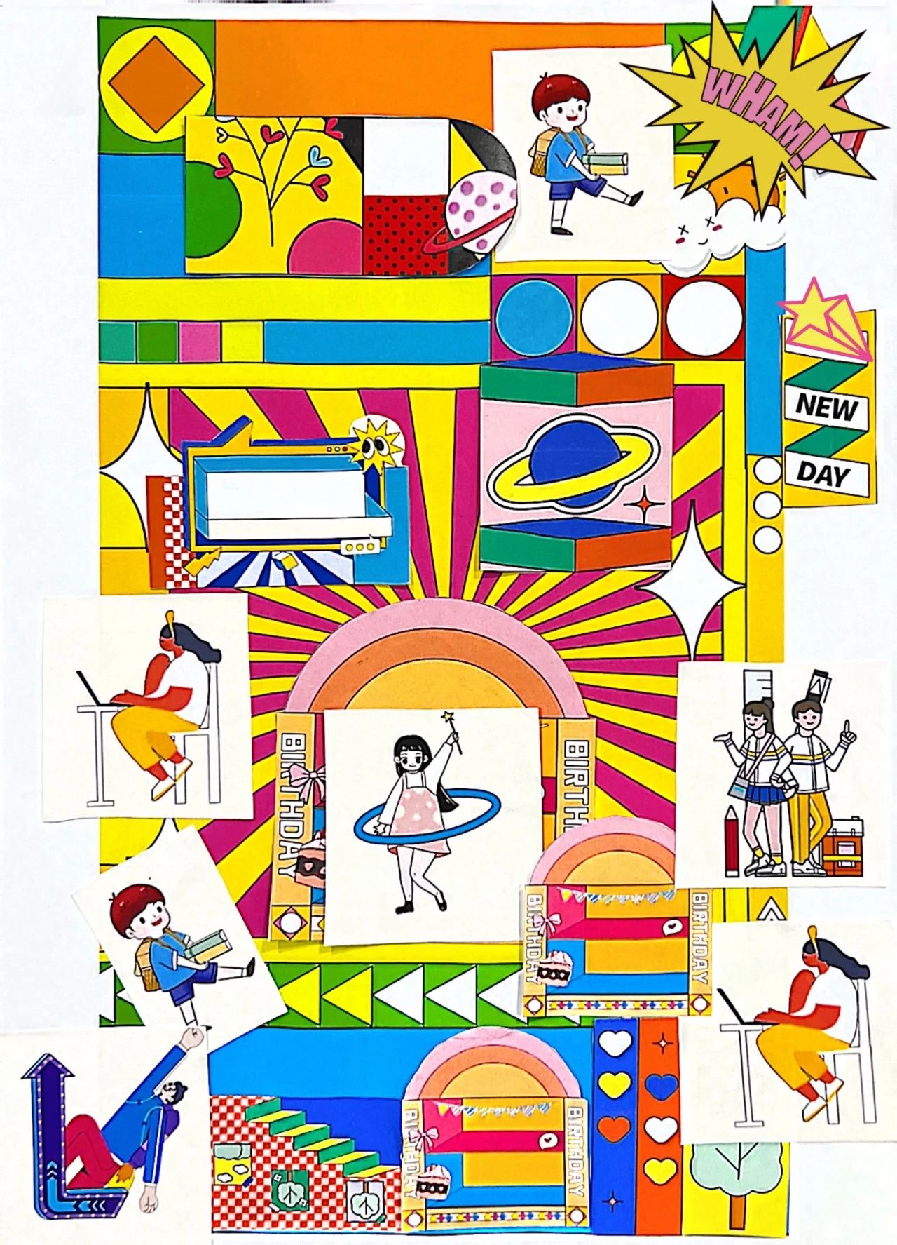 在本活动中,同学们可以用1-3个素材来共同设计拼贴海报,大家在现场充分体会到海报设计的乐趣与不易。现场创意迸发,同学们接龙拼贴自己心仪的素材贴纸,属于记者的创意精神也铭刻于大家心中。下面是本次活动中大家共同完成的海报: