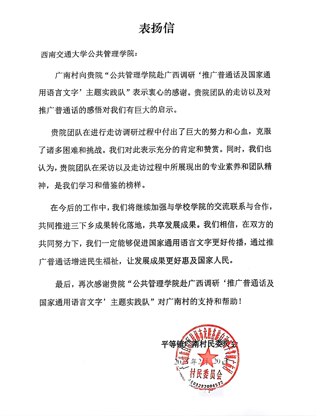 在调研结束后,实践队还收到了龙胜各族自治县广南村发来的表扬信,信中表达了对实践队关于国家通用语言文字推广工作的认可,并且大力赞扬了实践队员的专业能力和认真态度。