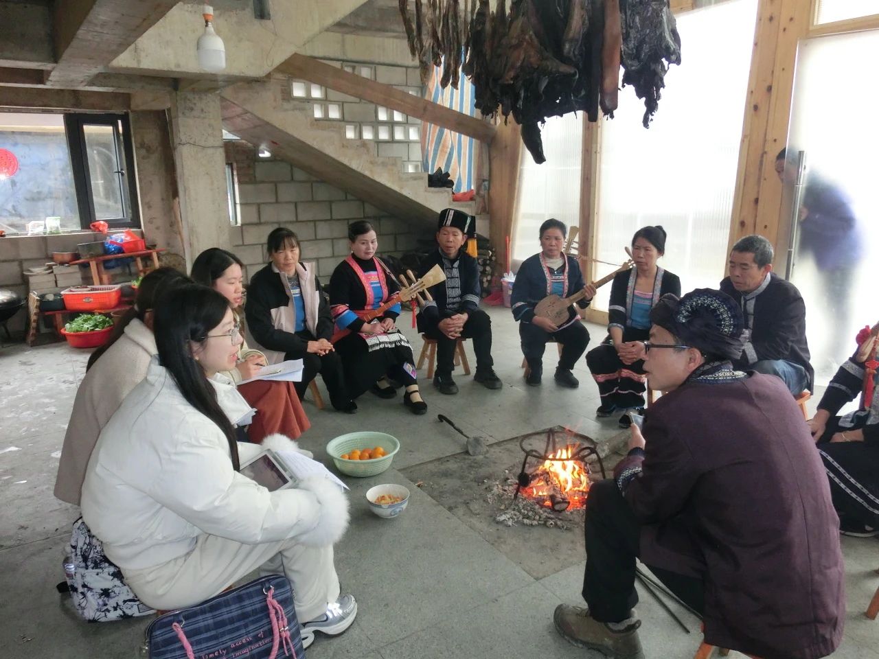 调研进入尾声之余,热情的广南村村民们为实践队员们带来了精彩的民俗表演。火塘中木柴“噼啪”作响,村民们身着传统服饰,手持琵琶灵动拨弦,伴随着清脆乐声唱起了动听的侗族歌曲。