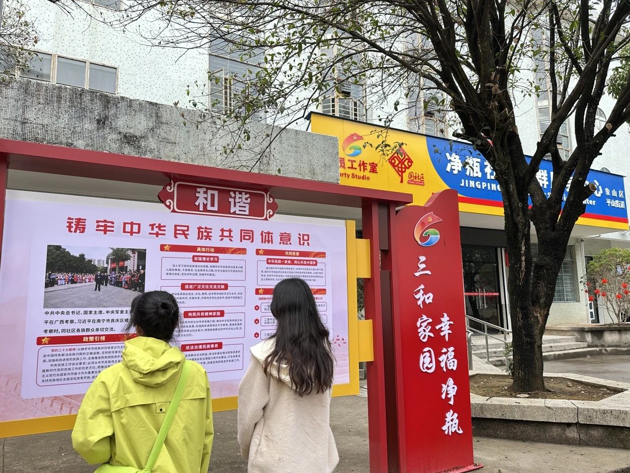 随后,小分队来到桂林市象山区净瓶社区,实地考察社区在国家通用语言文字推广和民族团结宣传中的创新实践。社区负责人介绍,近年来通过“普通话课堂”“民族双语宣传栏”“民族团结主题文化活动”等载体,有效提升了居民语言能力与文化认同。净瓶社区将语言普及与民族团结教育深度融合,形成了可复制、可推广的基层经验,为多民族地区社会治理提供了宝贵范例。