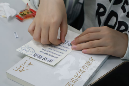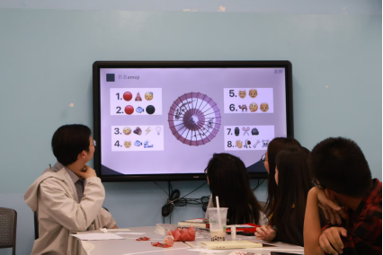 除了创意拼贴,班会还设置了“私藏书单盲盒”“书名emoji猜猜乐”“红楼击鼓传花”等趣味游戏环节。同学们随机抽取盲盒中的书单卡片,分享《平凡的世界》里的奋斗故事、《白夜行》中的人性叩问;在书名emoji猜猜乐中,师生望着熟悉的书名变成一个个有趣的emoji,或专注倾听,或踊跃参与,思维的火花在交流中不断迸发,全场师生沉浸在轻松愉悦的氛围中。
