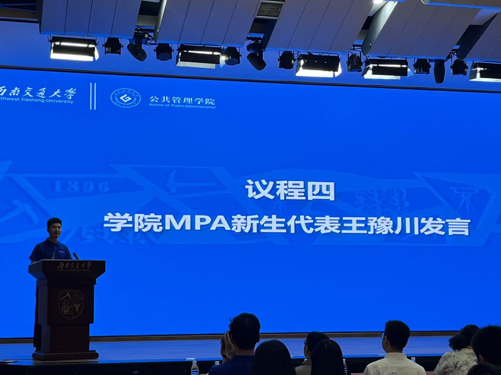 当开学典礼进入新生代表发言环节,2025级MPA新生王豫川受邀登台。作为全体新生的代表,他结合自身经历与对公共管理领域的思考,向在场领导、老师及同窗传递新生群体的心声与期许。王豫川表示,作为求知者,他深刻认同学院“交通+”“城市+”特色,号召新生以“空杯心态”学习;作为同行者,他引《礼记》名句,呼吁新生协作共进;作为担当者,他强调公共管理关乎民生,立志做“懂理论、会实践”的公管人,还寄语师生共赴求学韶华。