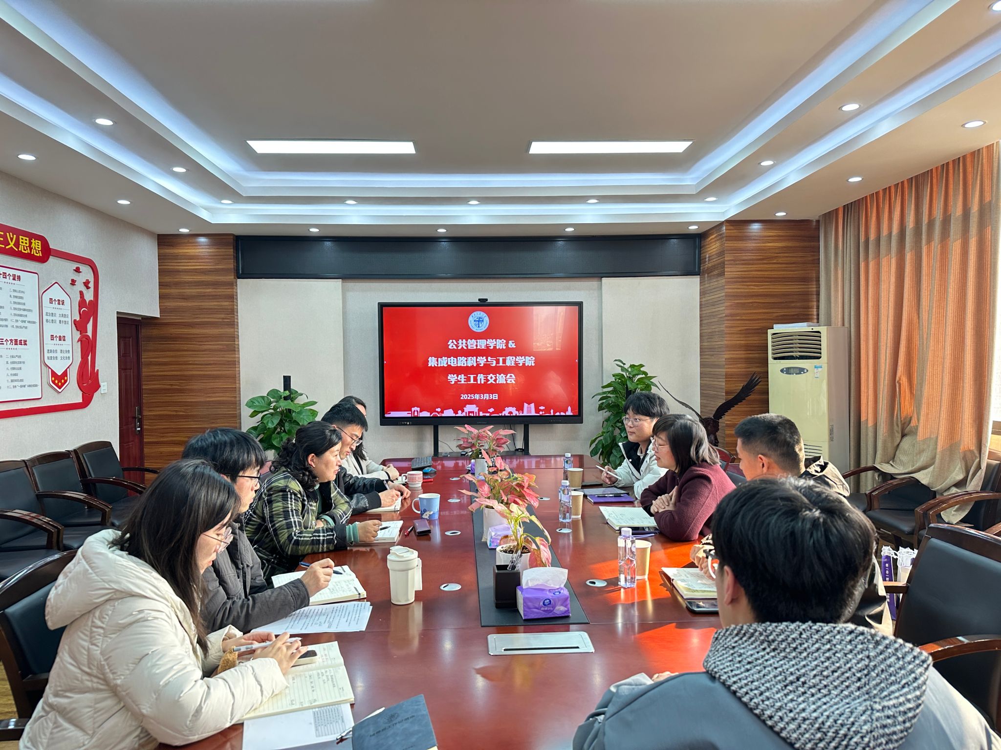 2025年3月3日下午,集成电路科学与工程学院(中车时代微电子学院)党委副书记、学工组组长王艳一行到太阳集团官网进行学生工作交流,suncitygroup太阳集团党委副书记、学工组组长薛婧,团委书记、学工组副组长莫太林以及各年级辅导员参与交流座谈。